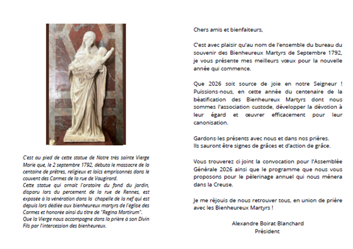 La prochaine Assemblée Générale du souvenir des Bienheureux Martyrs de 1792 aura lieu dans le réfectoire du séminaire des Carmes, au 70 rue de Vaugirard Paris 75006, le samedi 28 mars 2026 :- 10h30 : Café partagé et croissants